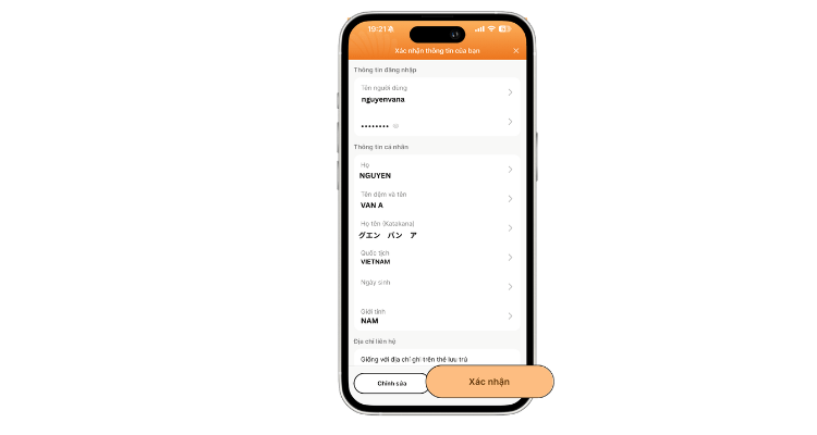 Quý khách vui lòng xác nhận lại địa chỉ cư trú hiện tại có trùng khớp với địa chỉ trên Giấy tờ tuỳ thân không. Sau đó bấm Có (nếu giống) và Không (nếu cần chỉnh sửa).