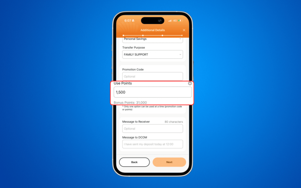 You can use your Bonus Points to reduce your remittance service fee directly in the DCOM Money Express App.