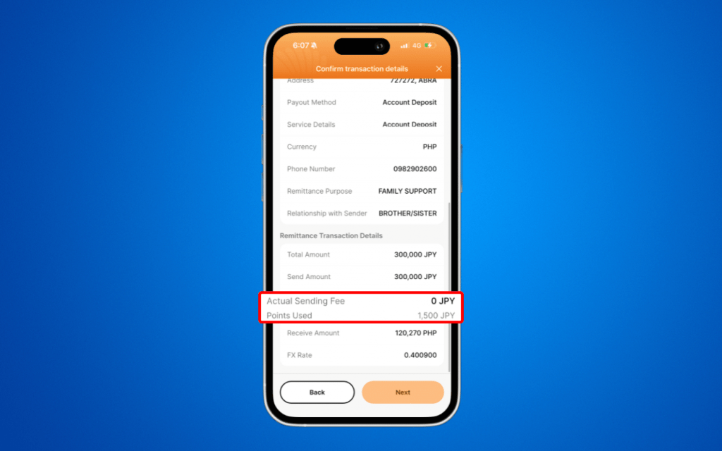 Tap Next, review your transaction details, and complete your remittance.
