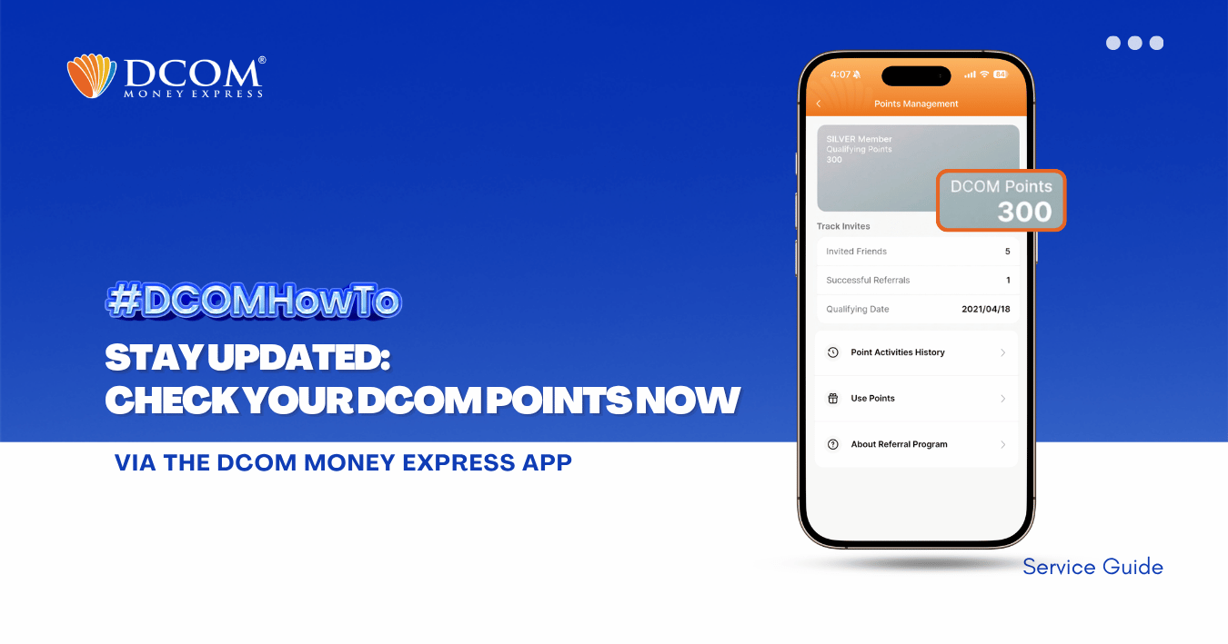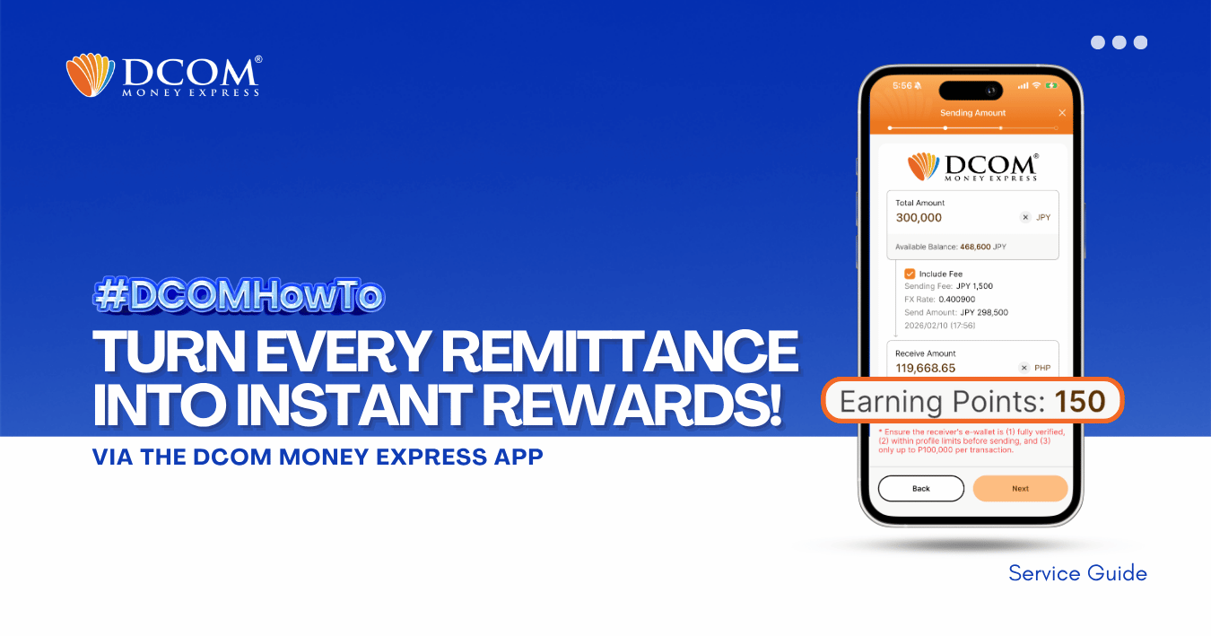 Why pay more when you can save? Every time you send money with DCOM, you earn points that can be used to lessen your service fees. Maximize your hard-earned money and enjoy a more rewarding way to remit today! STEP 1: ...