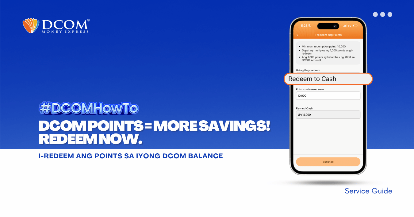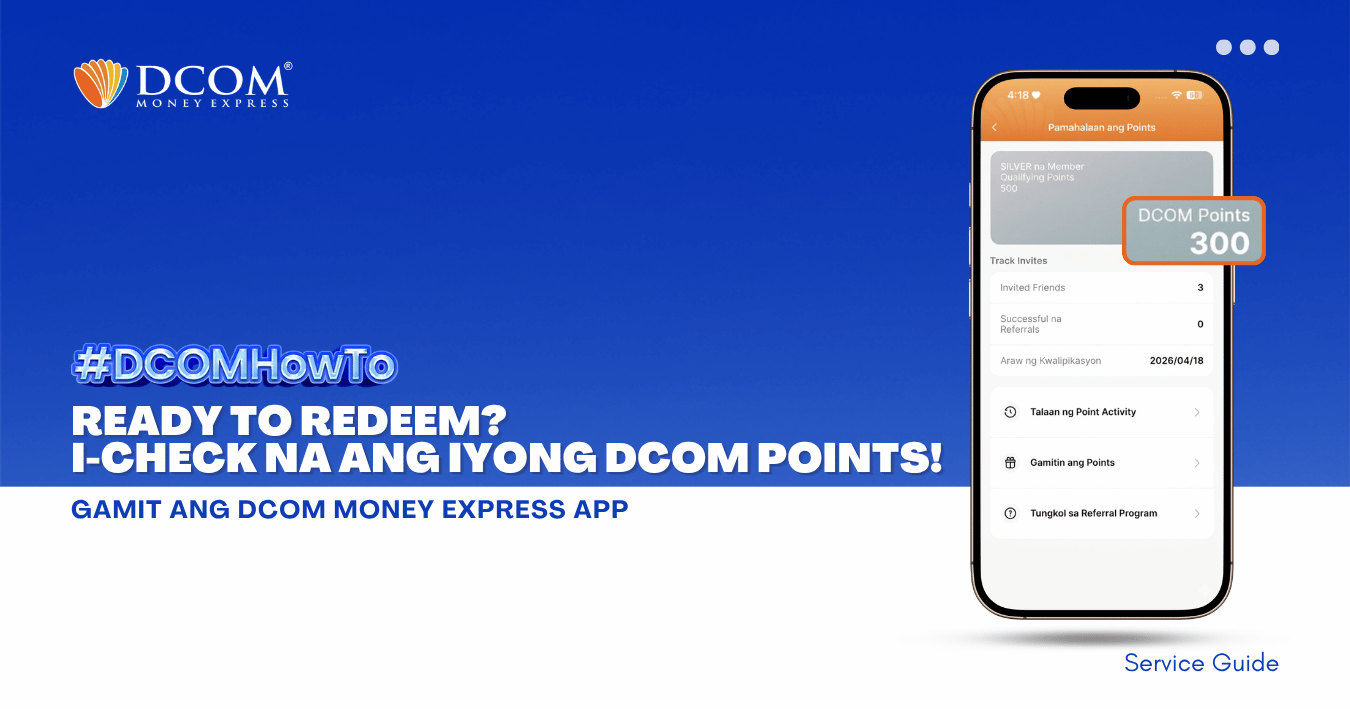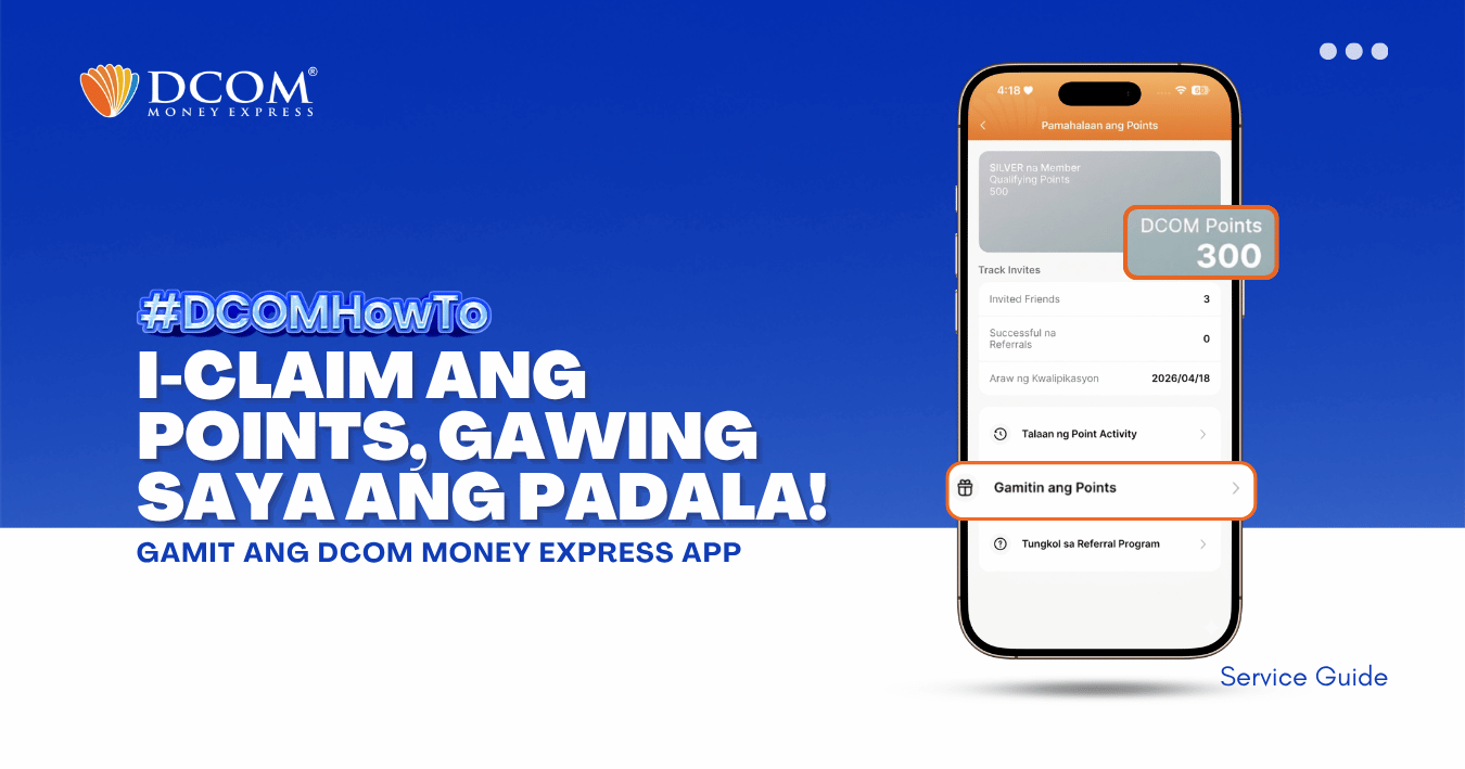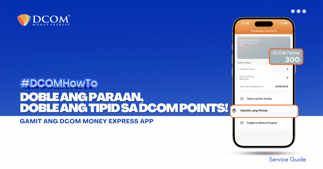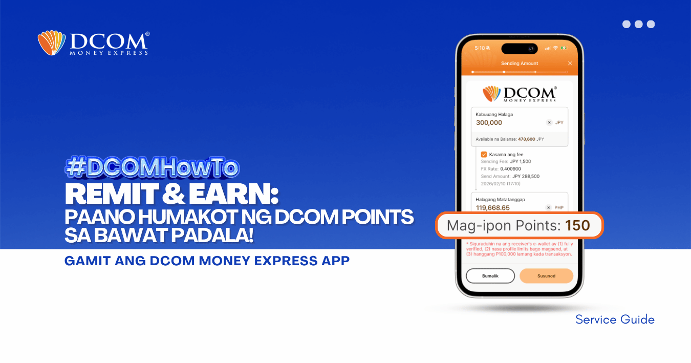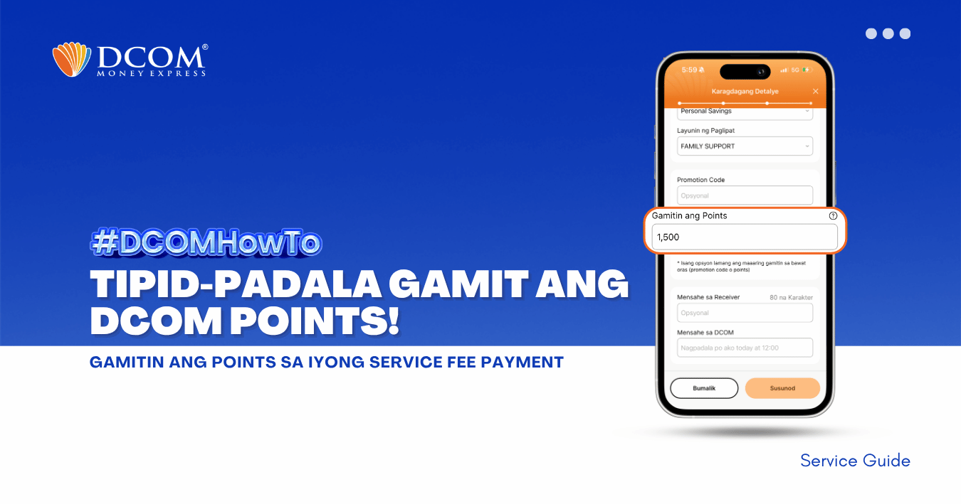 Huwag palampasin ang pagkakataong makatipid! Alamin ang dalawang simpleng paraan para humakot ng points na pwedeng gamiting pambawas sa service fee. Mas maraming points, mas malaki ang savings para sa pamilya! 1. Earn Points sa Bawat Completed Remittance gamit ang DCOM ...