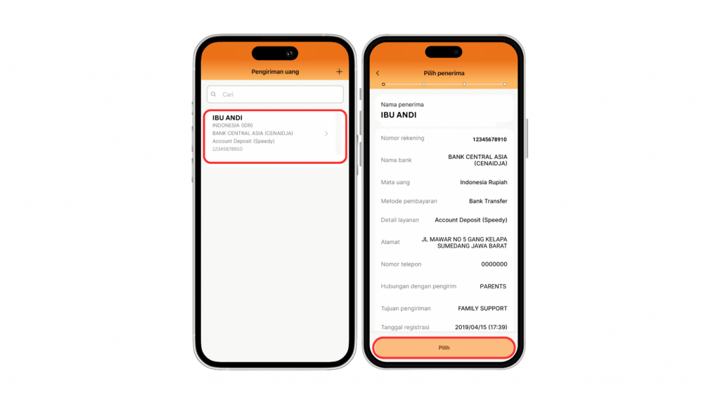 Langkah 2: Pilih data penerima dan pastikan data penerima sudah tepat. Lalu klik Pilih