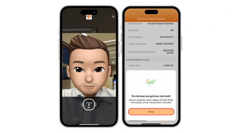 Langkah 6: Mohon untuk melakukan verifikasi dengan melakukan pemindaian wajah (foto live) untuk memastikan pengiriman uang atas persetujuan dan sepengetahuan dari pemilik akun. Jika verifikasi berhasil, transaksi Anda akan segera terproses dan Anda akan diminta untuk mengklik Tutup.