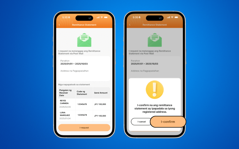 3. Pindutin ang I-request button at I-confirm ang iyong address na papadalhan ng Remittance Statement