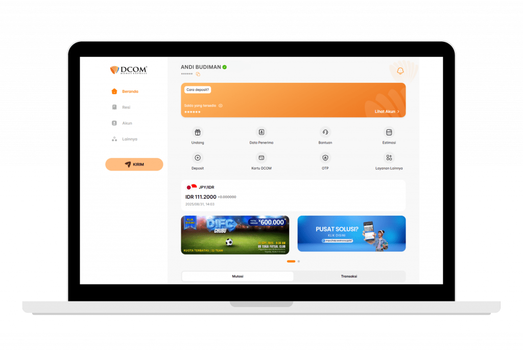 Setelah sukses merilis aplikasi mobile, kini DCOM Money Express resmi hadir dalam versi website untuk memberikan pengalaman yang lebih fleksibel dan mudah diakses. Kami percaya bahwa setiap pengguna punya cara berbeda dalam menikmati layanan, dan versi web ini adalah jawaban buat Anda yang ingin akses cepat tanpa harus mengunduh aplikasi.